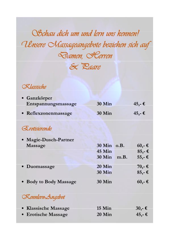 Schau Dich um und lern' uns kennen. Wir bieten Dir wundervolle, sinnliche, erotische Verwöhnmassagen unter dem Motto: Weg vom Alltäglichen - hin zum Außergewöhnlichen. Tauche ein, in die Welt der Erotik und Magie, lass Dich entführen, umgarnen, Genieße und Entspanne in einer phantastischen Welt voller Überraschungen!